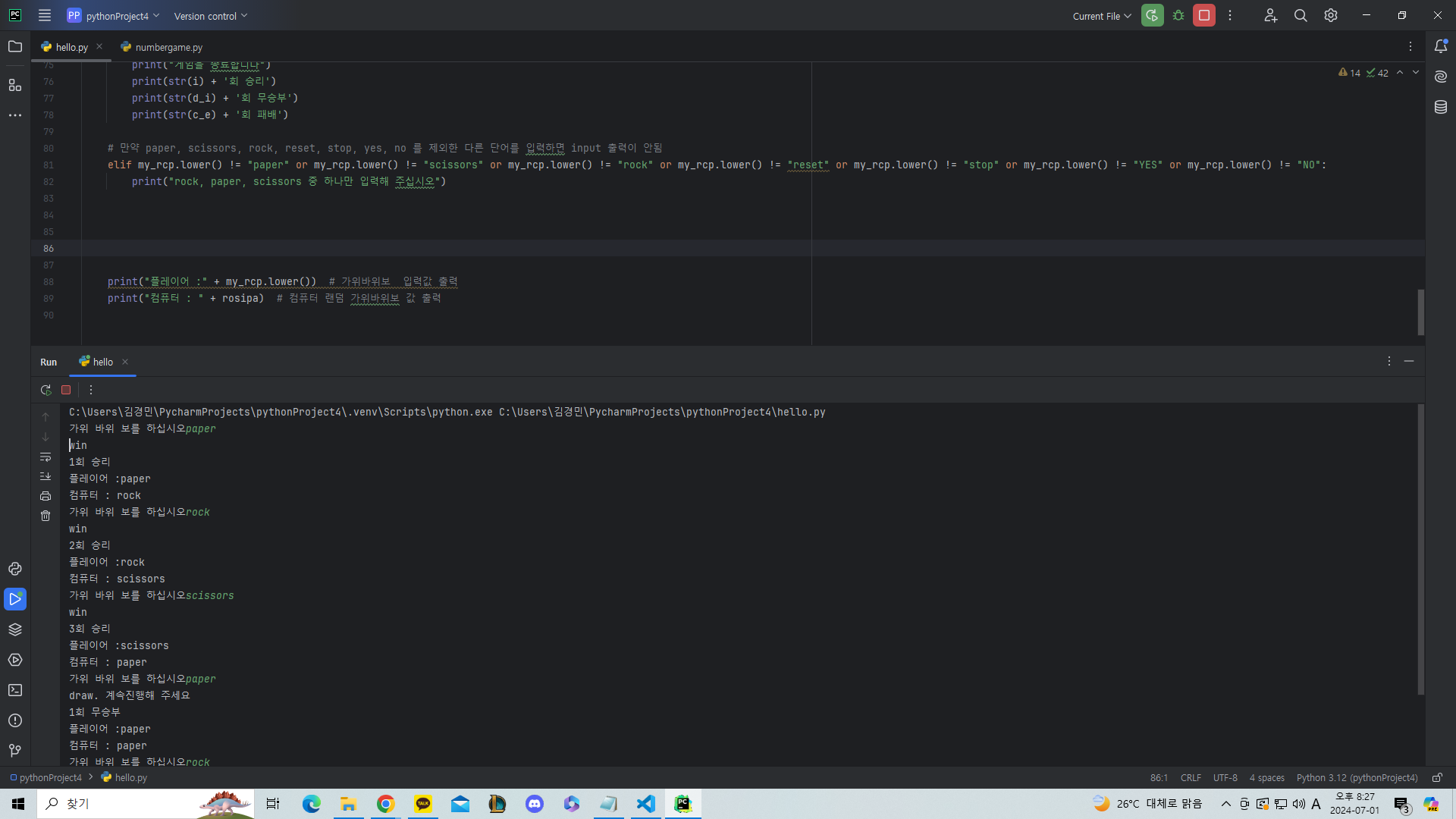 elif my_rcp.lower() == "scissors" and rosipa == "paper": #플레이어가 가위, 컴퓨터가 보자기 를 낸 경우