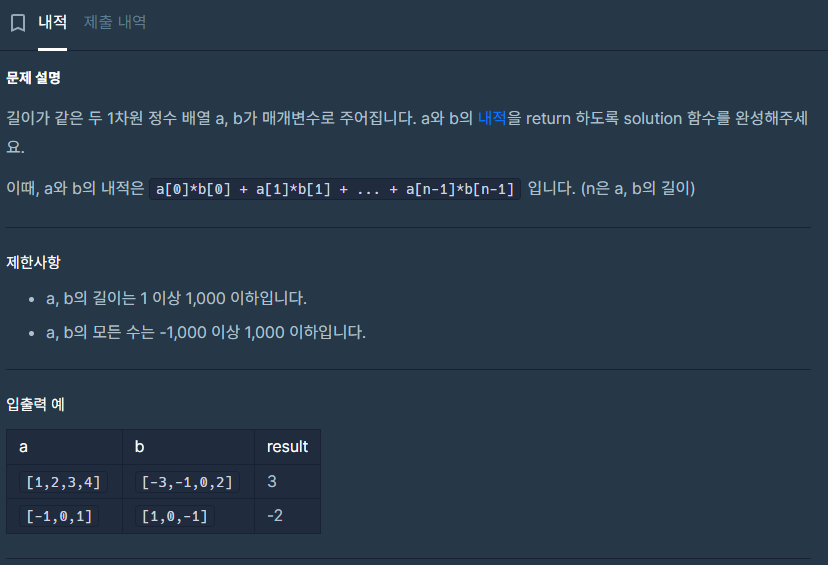 오늘은 내적이라는 프로그래머스 문제를 풀었다.
