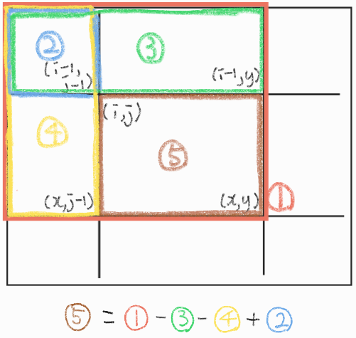 partSum = prefixSum[x][y] - prefixSum[i-1][y] - prefixSum[x][j-1] + prefixSum[i-1][j-1]
